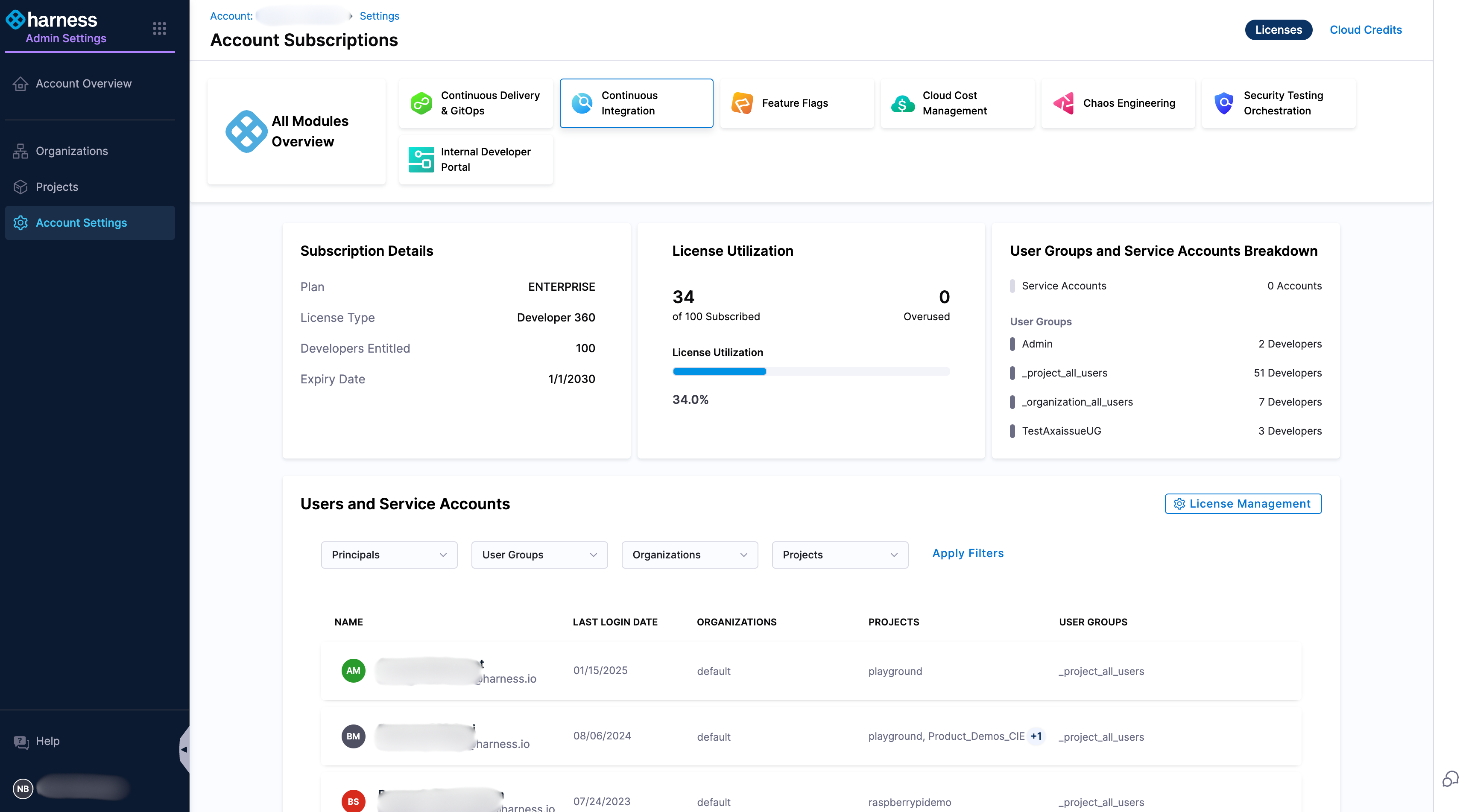 In your Harness account, go to Account Settings and Account Details to view which Harness modules you are currently subscribed to. Subscriptions are shown in the Subscribed Modules section on the Overview page. You can select Manage to go to the Subscriptions page.